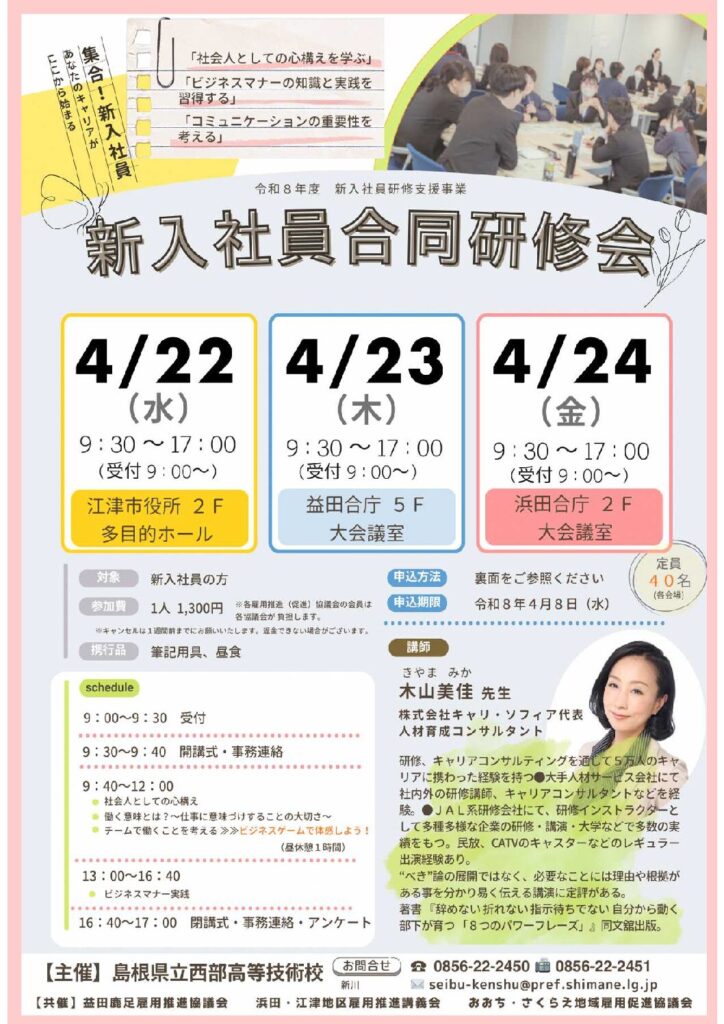 島根県立西部高等技術校より新入社員合同研修会開催の案内がありましたので、お知らせいたします。詳細につきましては、下記のチラシをご確認ください。なお、浜田・江津地区雇用推進協議会の会員様につきましては、本研修会の参加費用を雇用推進協議会にて負担させていたします。-【問い合わせ先】-------------島根県立西部高等技術校 電話:0856-22-2450/FAX:0856-22-2451メール:seibu-kenshu@pref.shimane.lg.jp